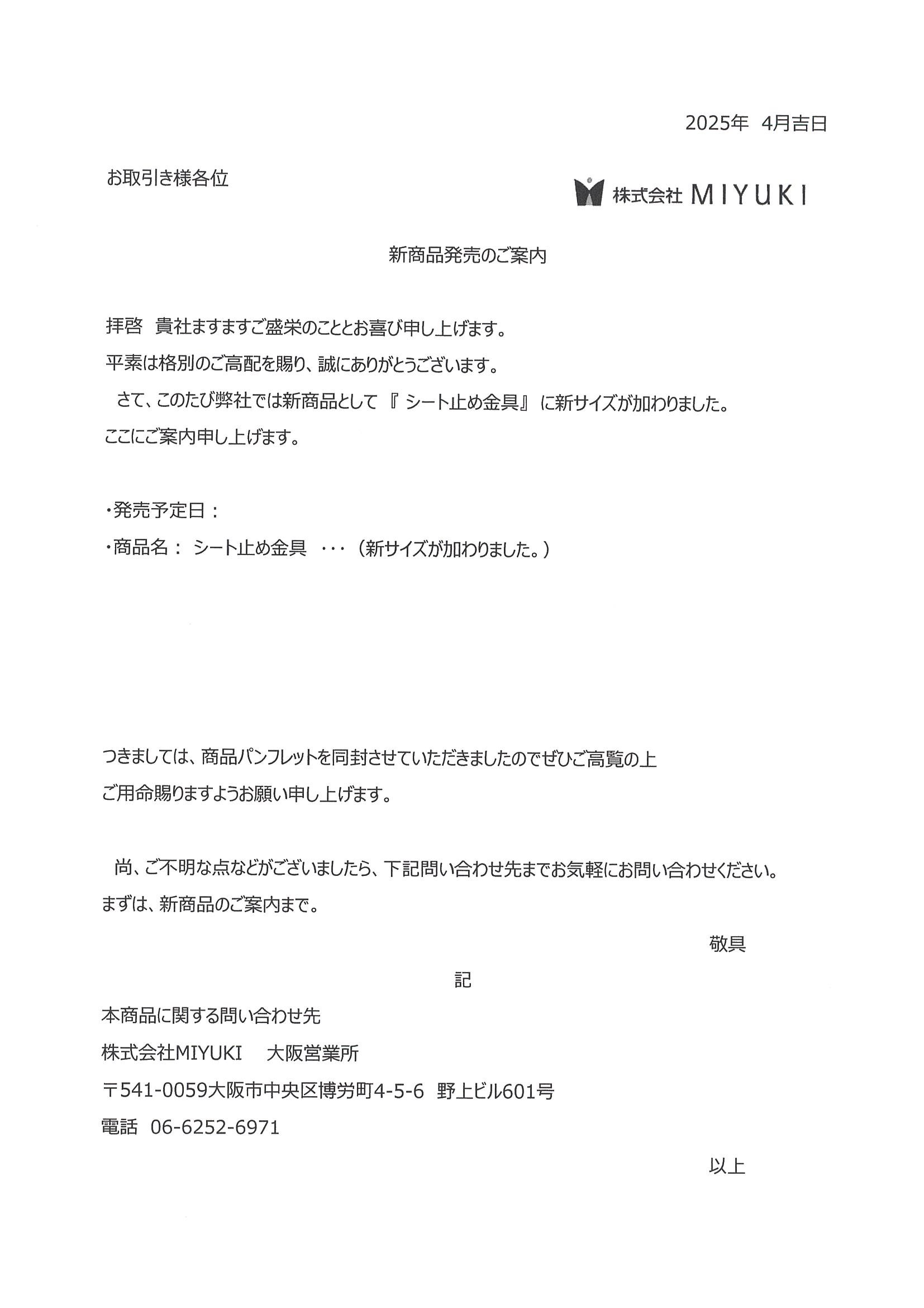 ![]() MIYUKI_新商品発売のご案内「シート止め金具」 |