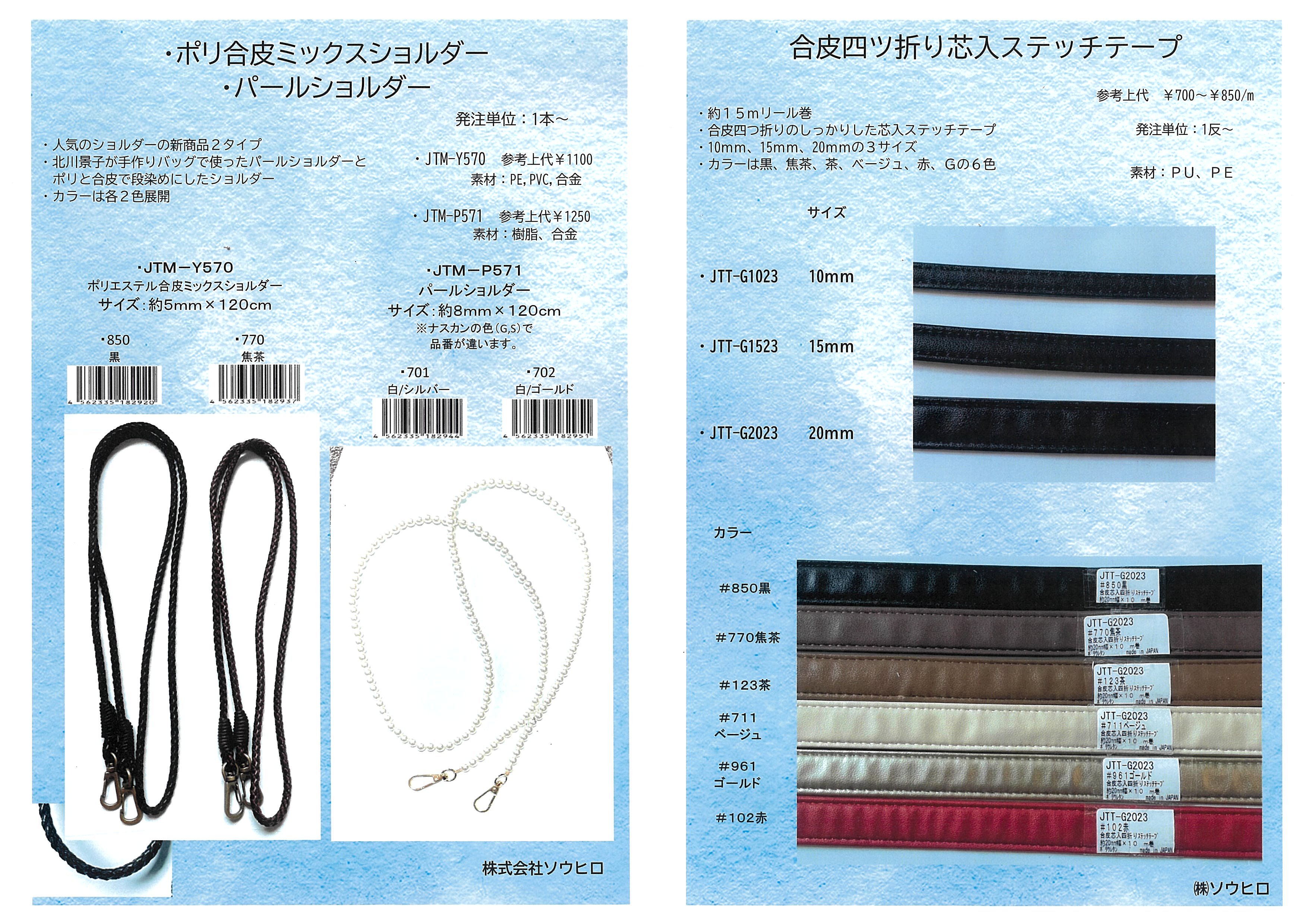 ![]() ソウヒロ_「ポリ合皮ミックスショルダーパールショルダー」「合皮四つ折り芯入ステッチテープ」 |