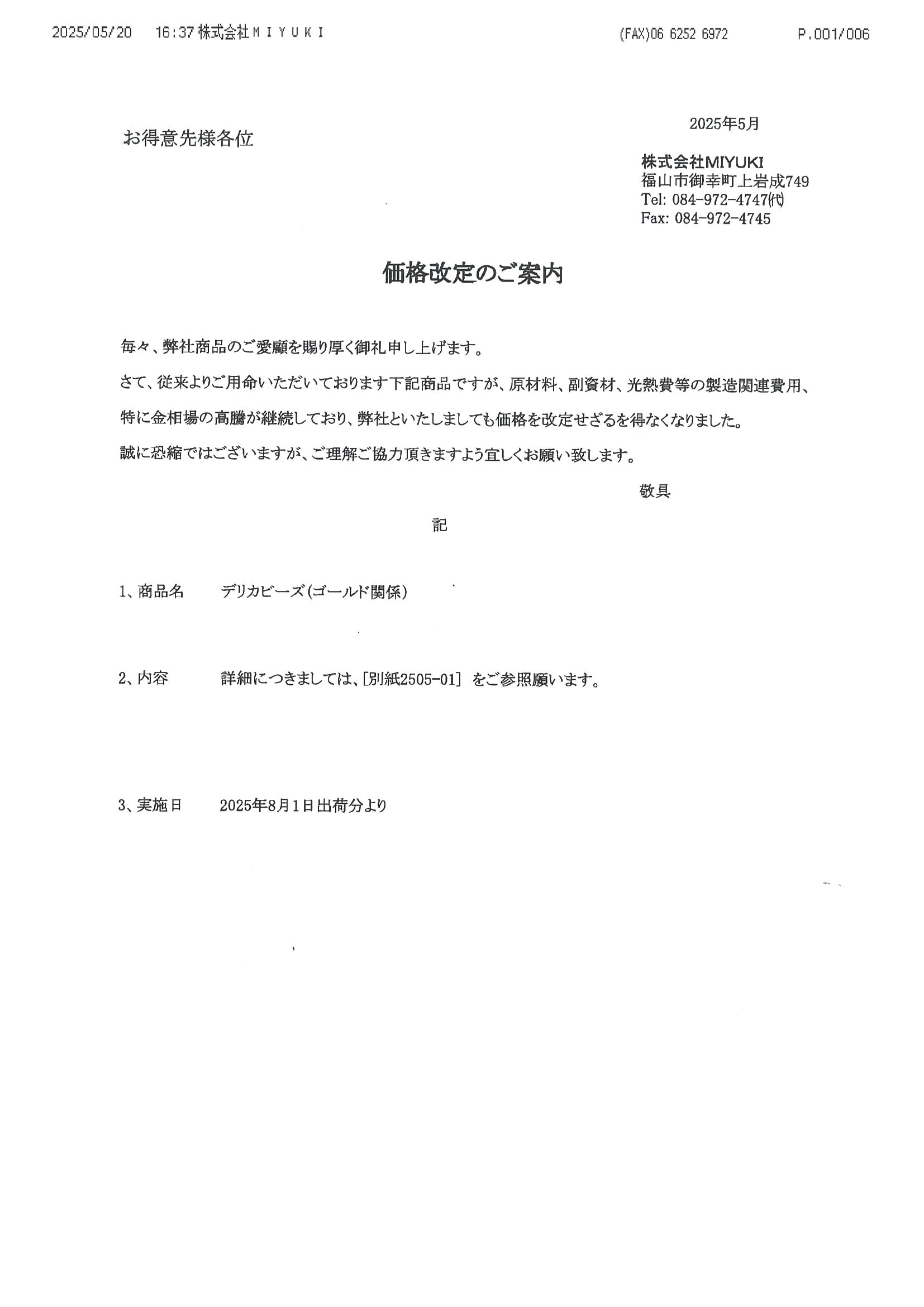 MIYUKI_価格改定のご案内「デリカビーズ(ゴールド関係)」2