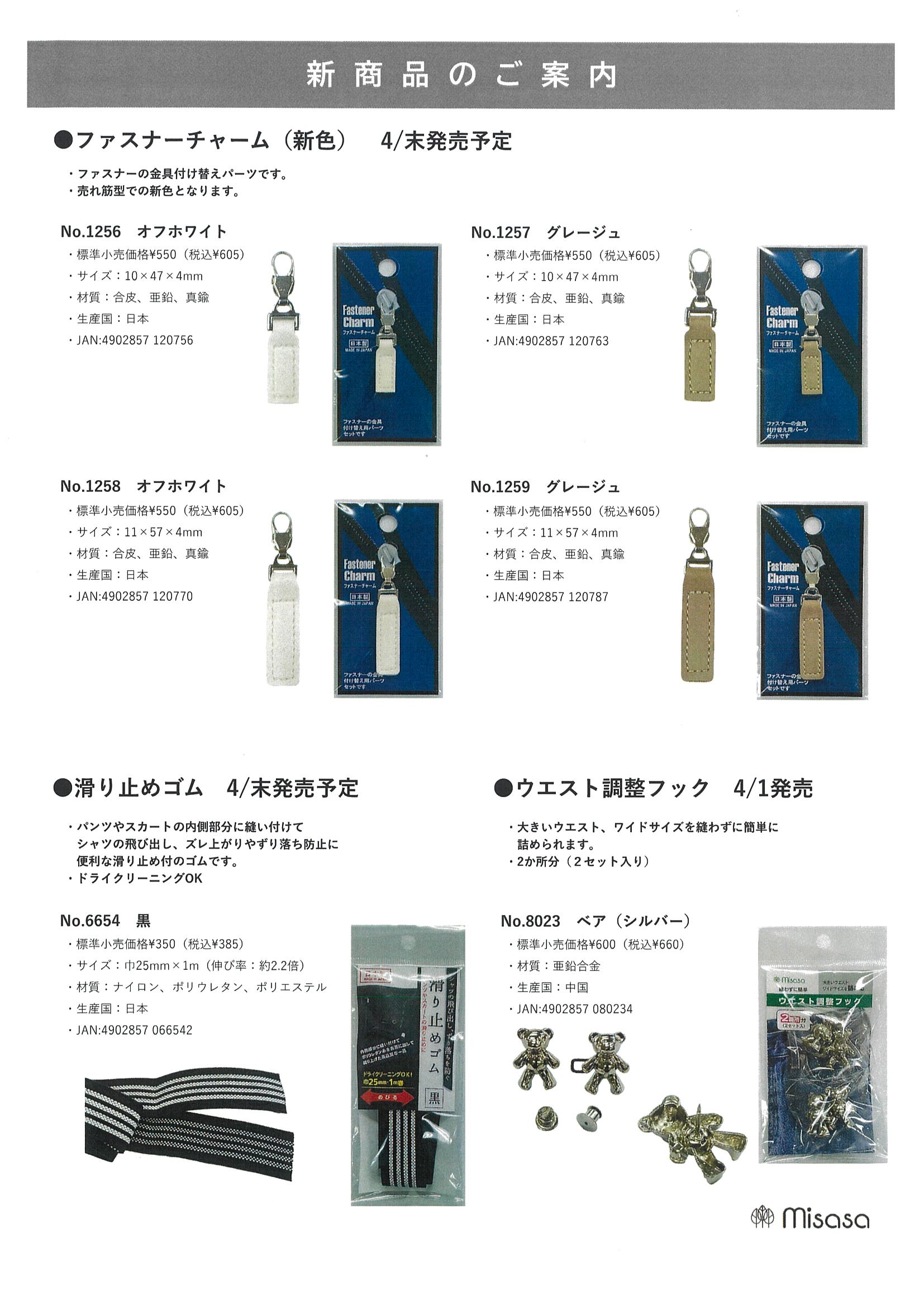 ミササ_新商品のご案内「ファスナーチャーム(新色)・滑り止めゴム・ウエスト調整フック」