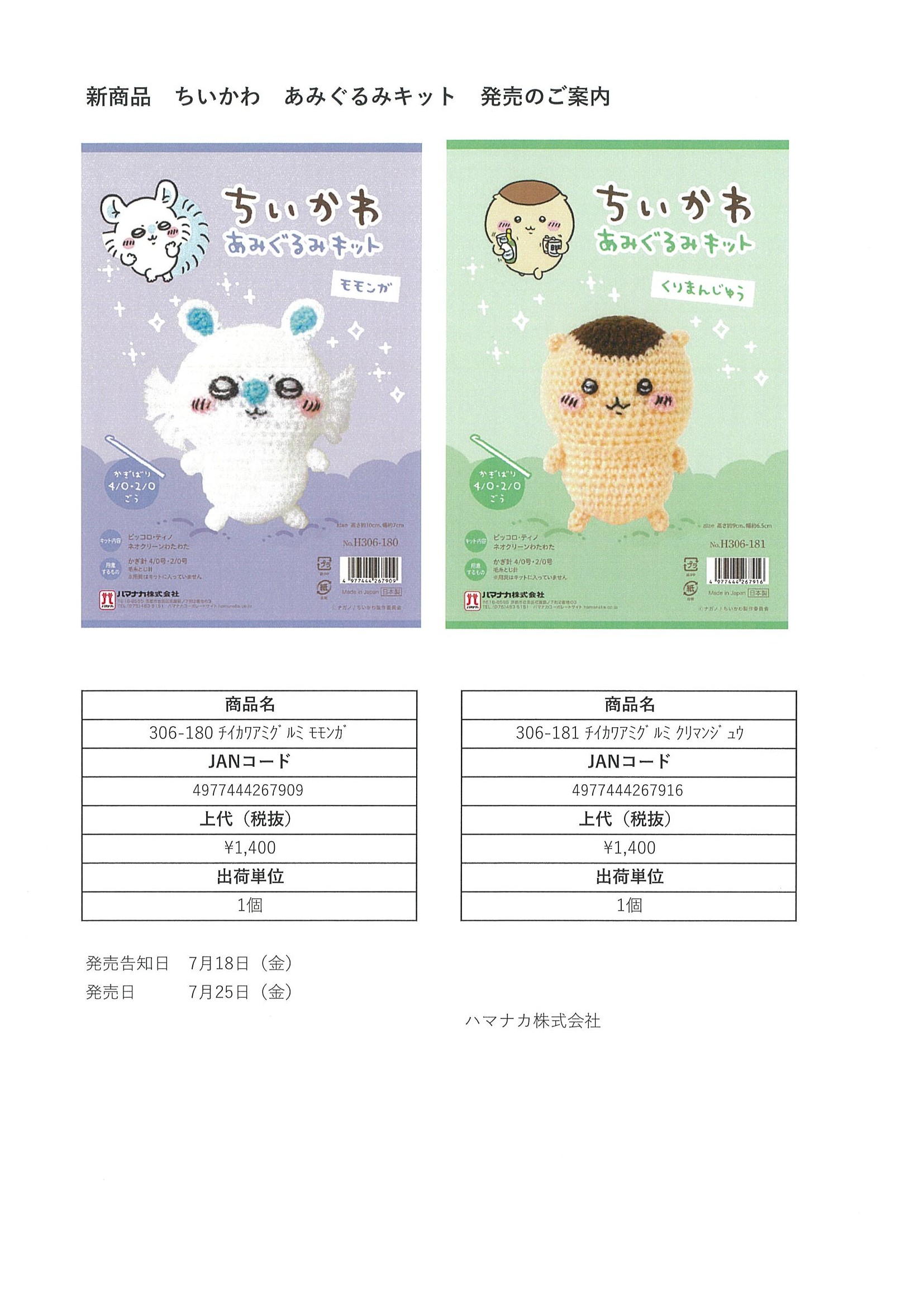 ハマナカ_「ちいかわあみぐるみキット」発売のご案内