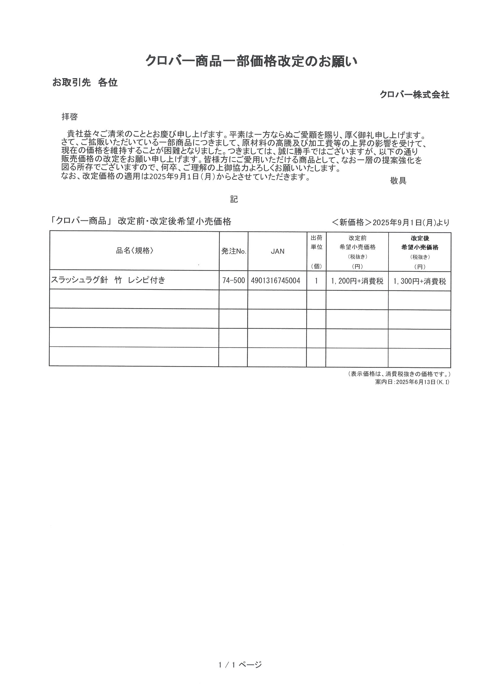 クロバー_商品一部価格改定のお願い「74-500」