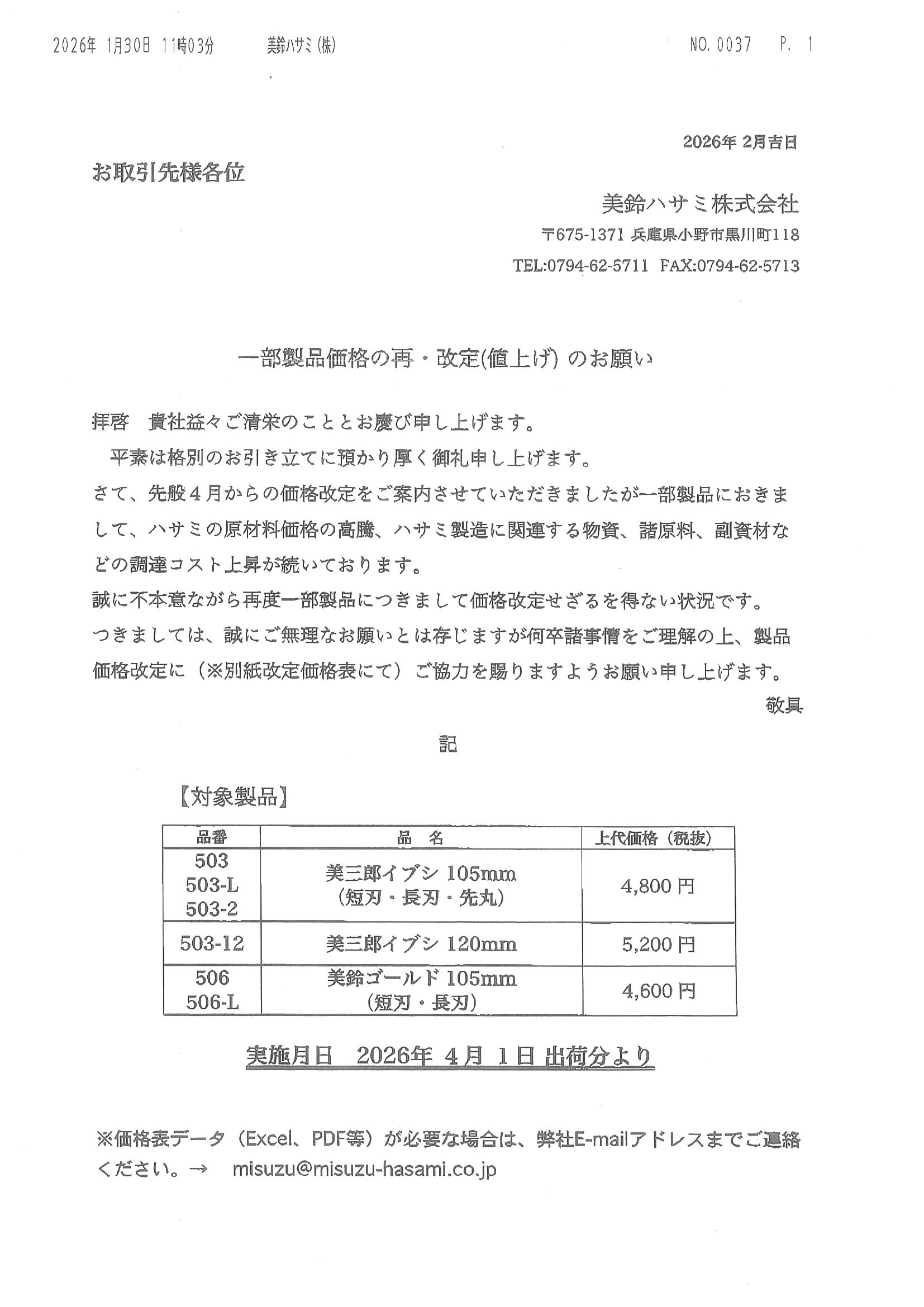 ![]() 美鈴ハサミ_「一部製品価格の再・改定(値上げ)のお願い」 |